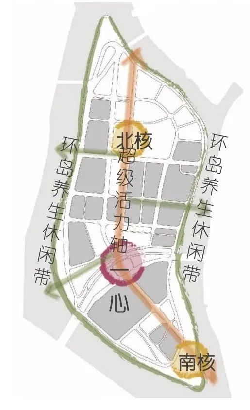 此外,在岛上还将打造创新型城市空间——超级活力轴,全长3080米,架设于人行道与机动车道之上,连接两边商业裙楼,串联全岛的核心产业空间。在全岛核心产业区沿线,结合裙房功能,打造一个全长约5公里,宽3~5米、高6~10米的雨棚连廊系统。允许该公共空间超出建筑退线,并不计密度、不计容。