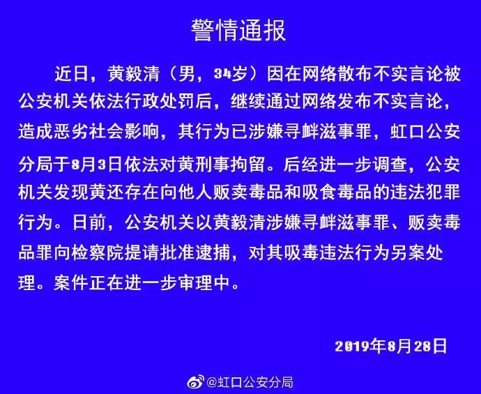 2020年7月10日,上海市虹口区人民法院依法公开开庭审理被告人黄毅清贩卖毒品案,并当庭宣判,以贩卖毒品罪判处被告人黄毅清有期徒刑十五年,剥夺政治权利三年,并处没收财产人民币五万元,缴获的犯罪工具予以没收。