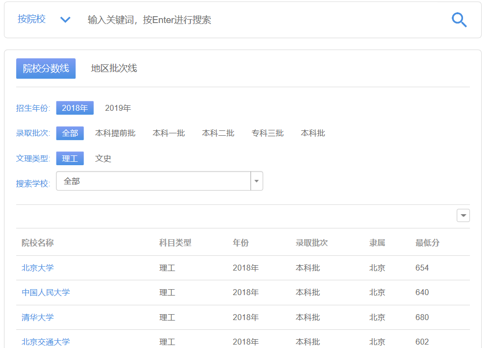 3、查询高校近年地区及院校批次线、分数线