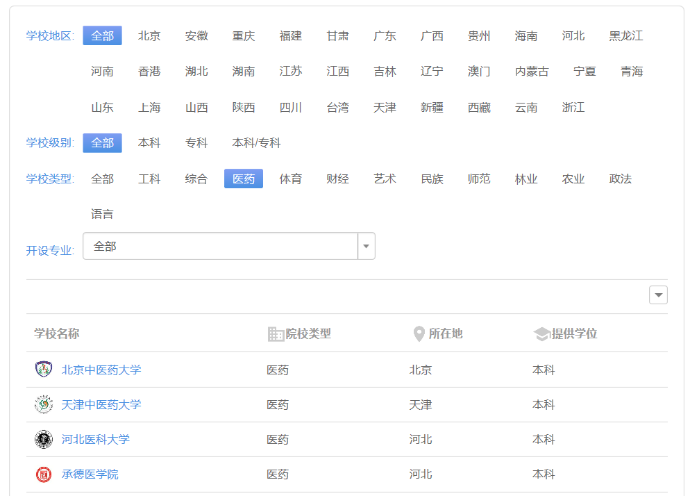 2、按层次、地域、专业等类别选择高校,查看高校信息