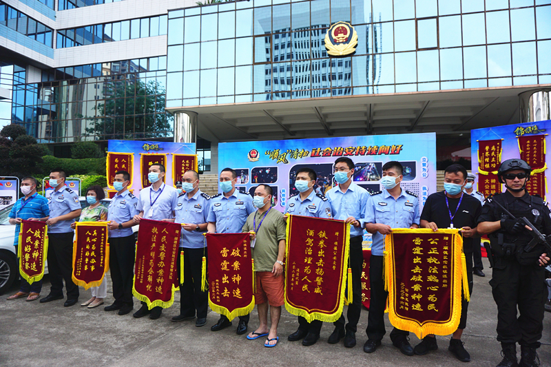 在当天召开的“顺风行动”打击整治成效新闻通报会上,6名事主来到现场,将锦旗送到民警手中,感谢民警热心为民、快速破案,并为社会治安持续向好点赞。据了解,今年上半年,佛山顺德公安已收到群众105面锦旗和18封感谢信。