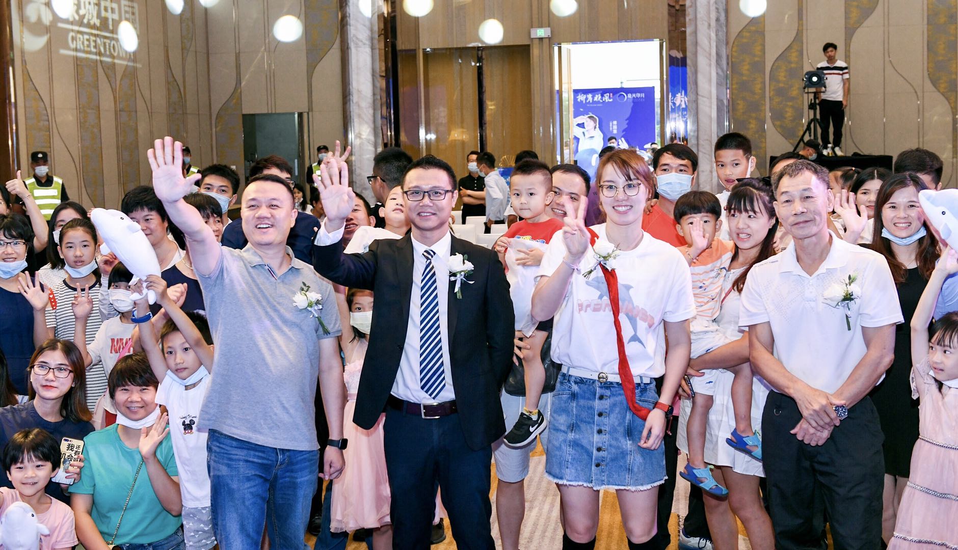 启动仪式最后,绿城中国华南区域广州项目总经理崔志博先生、绿城中国华南区域营销总监资义红先生、绿城中国华南区域广州项目营销总监张颖先生、绿城中国华南区域策划总监戴文杰先生、广州市南沙区游泳协会会长苏文仪先生携手傅园慧共同按下按钮,正式开启2020绿城“海豚计划”。