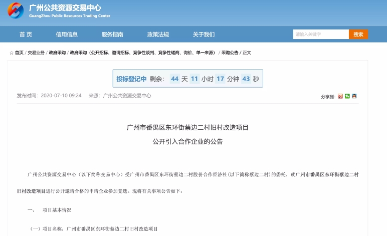 番禺又有一条旧村改造项目公开“招亲”了。近日,广州公共资源交易中心发布公告称,番禺区东环街蔡边二村旧村改造项目公开招标合作企业,要求合作企业需要符合总资产不低于200亿元(人民币),净资产不低于50亿元等条件。