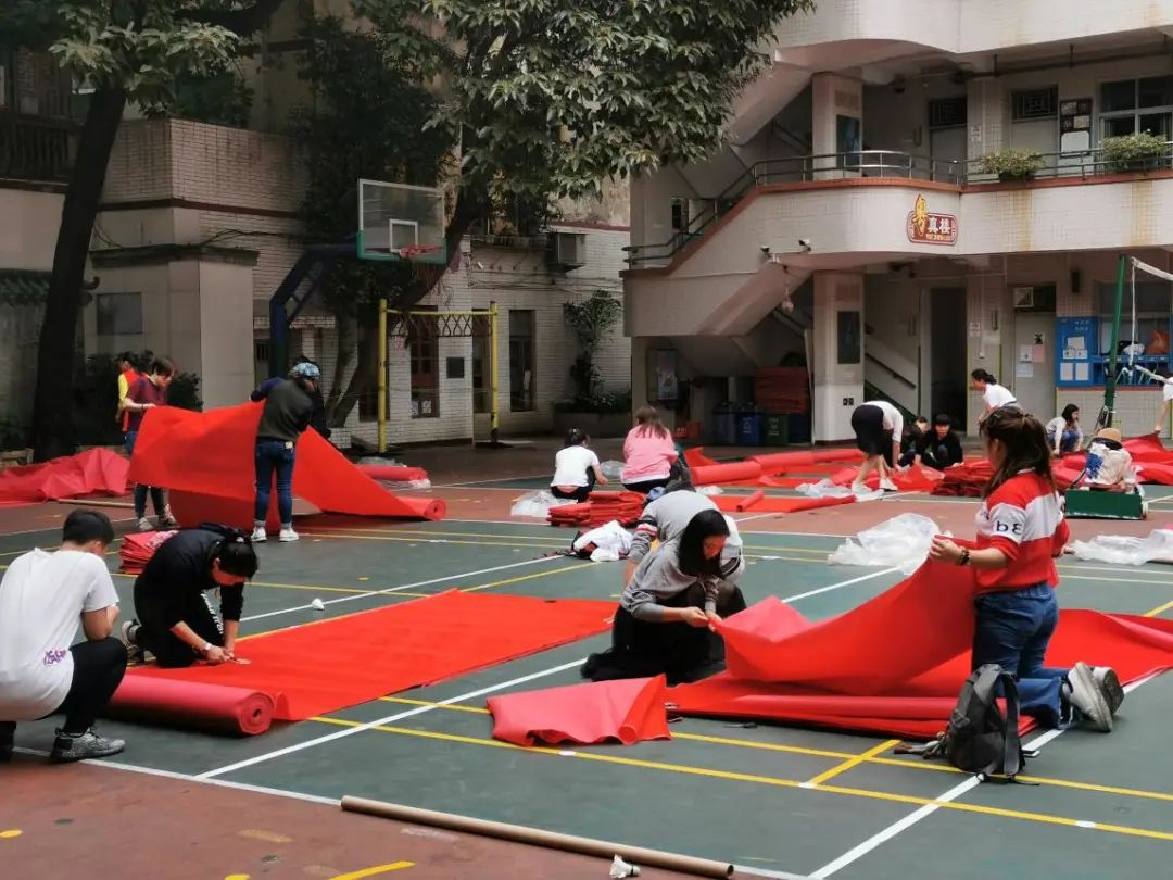放假前,老师和家长代表一起将购买回来制作披风的植绒布按照一二年级每位学生1.2米,三、四年级每位学生1.5米,五、六年每位学生1.8米-2米的比例裁剪,并分发到同学们的手上。
