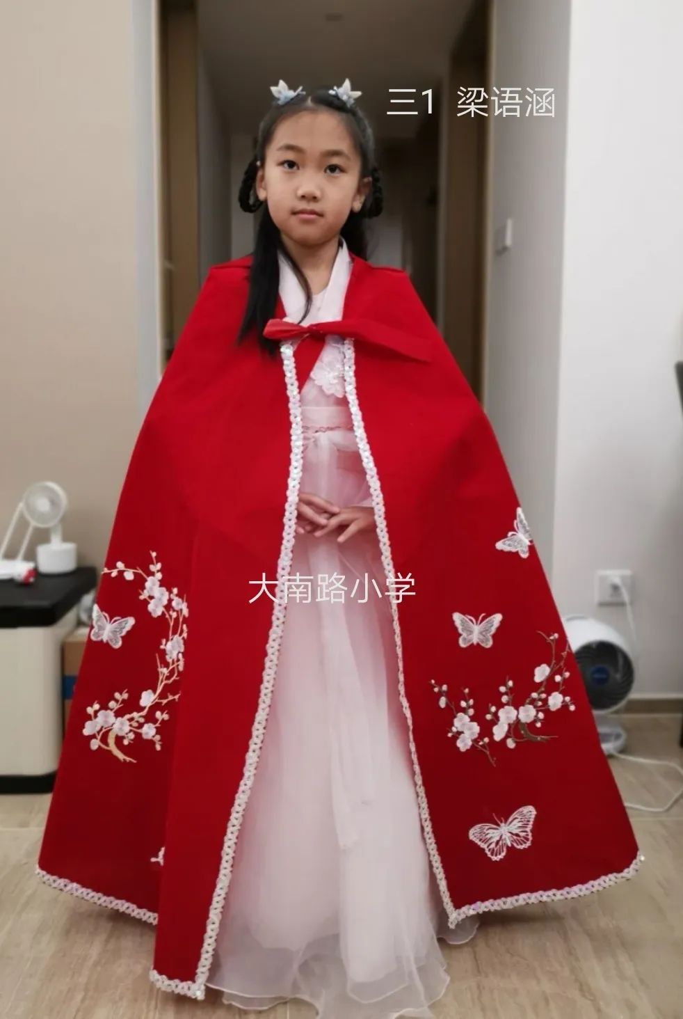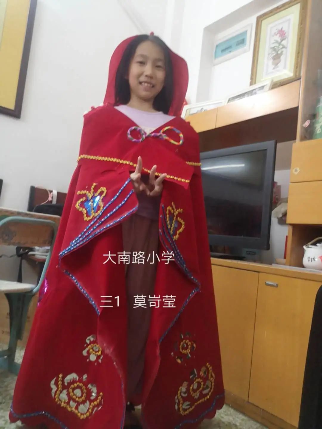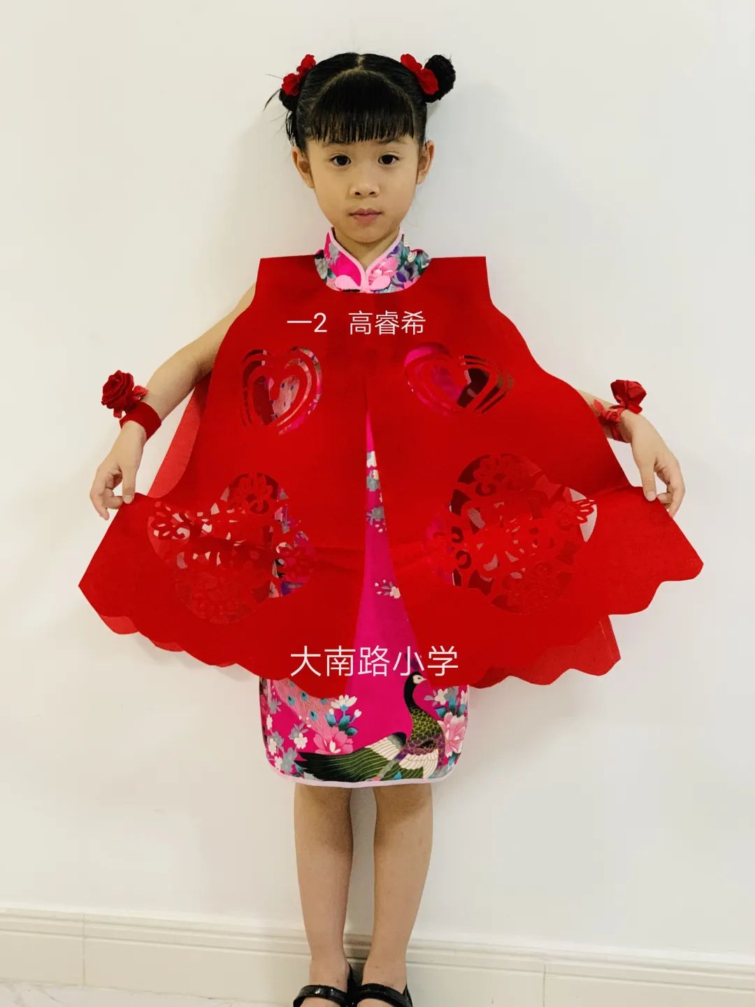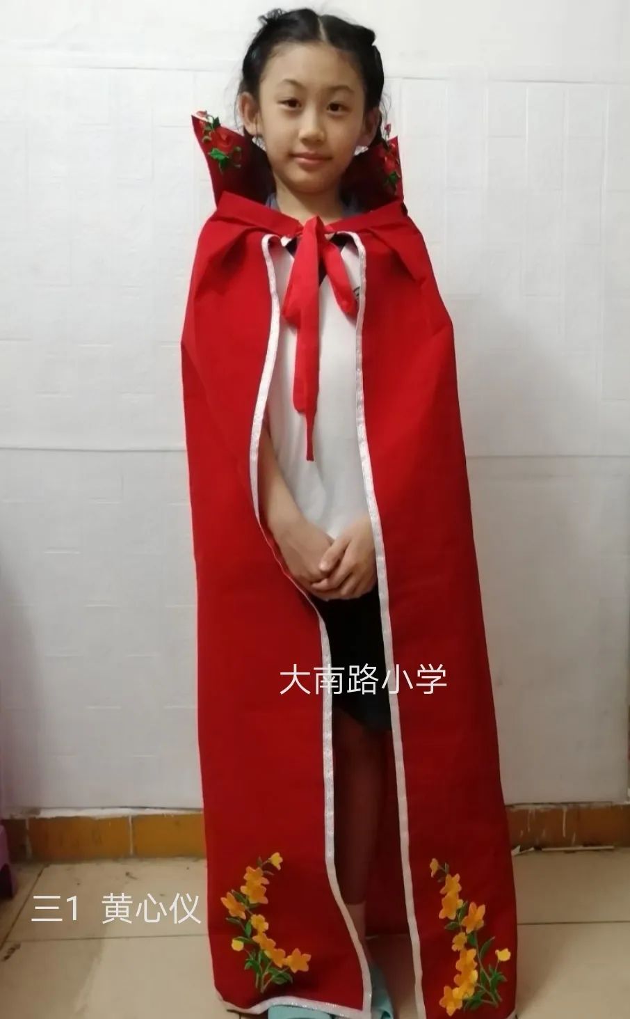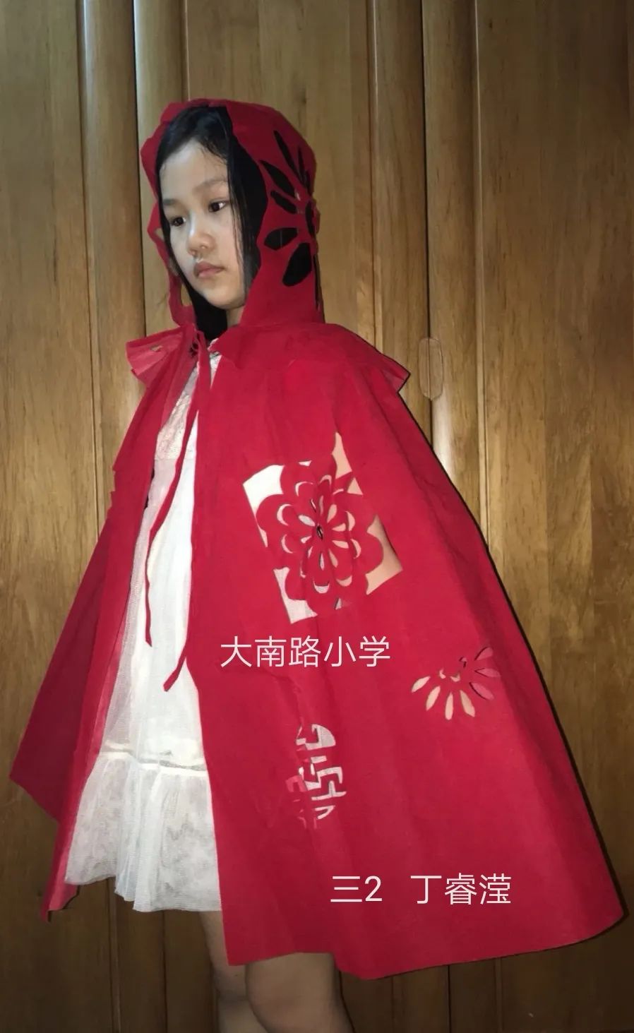“学校发原材料,让孩子们带回家和家长一起加工制作,要求尽量突出大红主题,有需要的也可以搭配其它颜色,披风上还可以发挥孩子们天马行空的想法,加入毛毛、花边、流苏等辅助物,让披风更有创意。”黎老师介绍道。