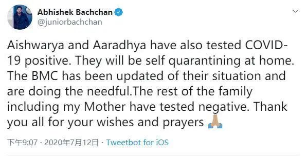 阿比谢克在12日通过社交媒体推特证实,他的妻子和8岁的女儿感染了新冠病毒。阿比谢克在推文中写道,“艾西瓦娅和阿拉迪娅的新冠病毒检测也呈阳性,她们将在家进行自我隔离。已经告知了孟买市政府她们的情况,正在做必要的工作。包括我母亲在内的其他人检测结果都呈阴性,谢谢你们所有人的祝福和祈祷。”
