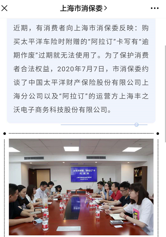 对此,上海市消保委近日约谈中国太平洋财产保险股份有限公司上海分公司以及“阿拉订”的运营方上海丰之沃电子商务科技股份有限公司。