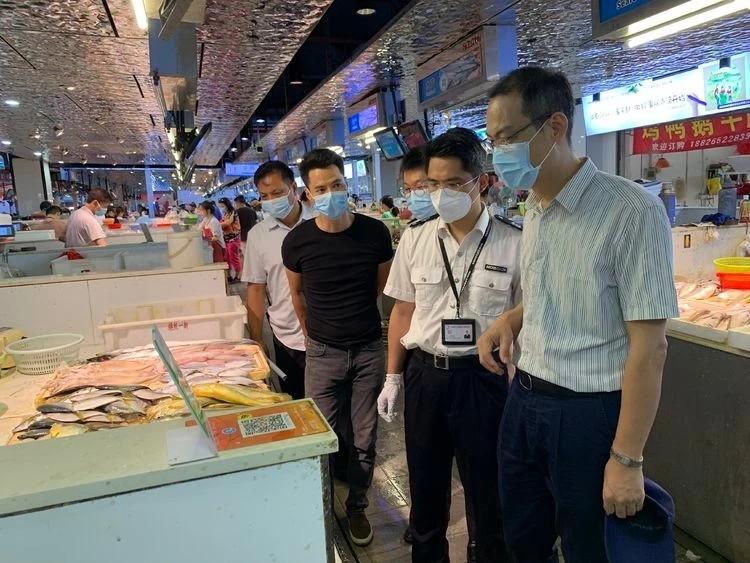 进口白虾包装样本中检测出新冠病毒后,深圳市场监管高度重视,按照省、市的紧急动员部署,市场监管各辖区局立即行动,对辖区内的相关产品进行检查。深圳市场监管局各辖区局执法人员对辖区内的农贸市场、商超、水产市场等销售海产品的场所开展集中检查,重点对检查销售水产品经营者是否严格落实进货查验记录,销售的水产品是否有合法来源,是否存在采购、销售来源不明水产品,但发现有泰国进口的南美白虾。执法人员已及时联系辖区疾控中心到经营冻库外环境及产品进行了核酸采样,并告诫经营户先暂停销售相关南美白虾并将产品封存,待核酸检测结果出来后再进行相应处理。