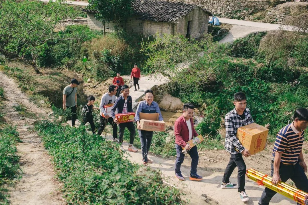 广东信宜的一个婚礼上,男方亲属提着彩礼走进女方的村庄