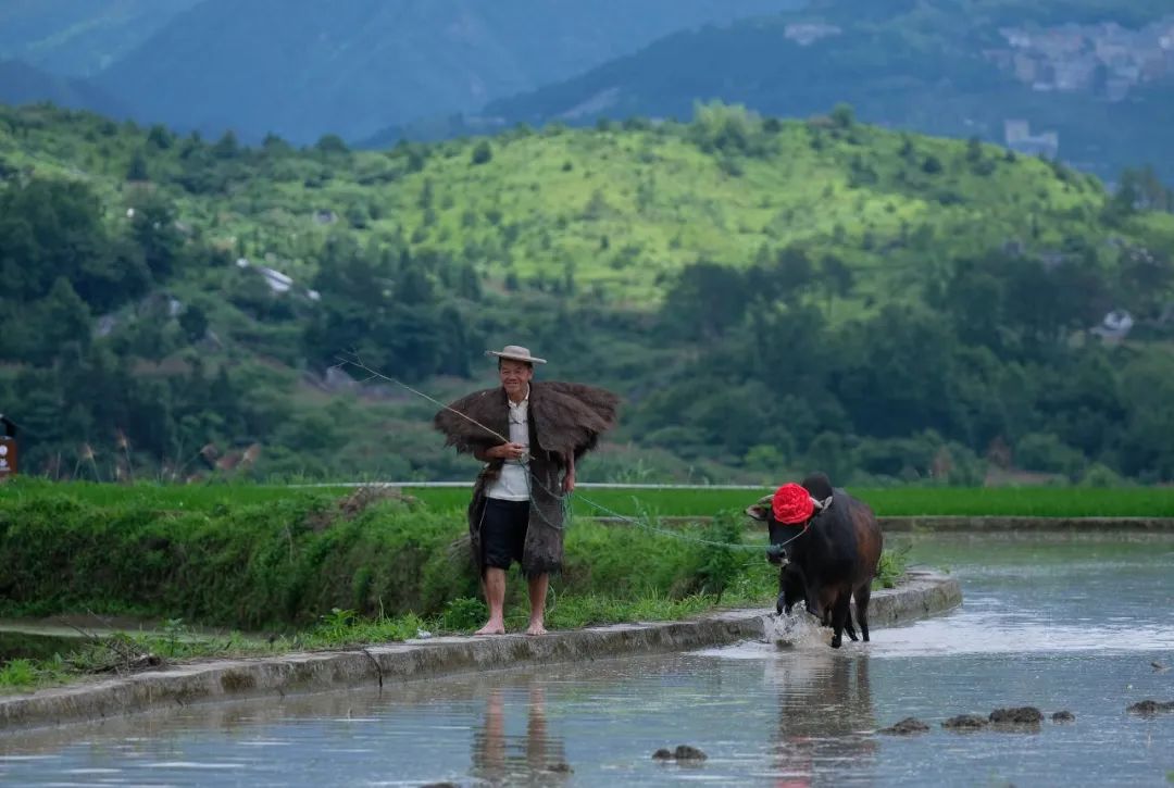 6月11日,浙江省青田县小舟山乡的农民牵着牛行走在水田中
