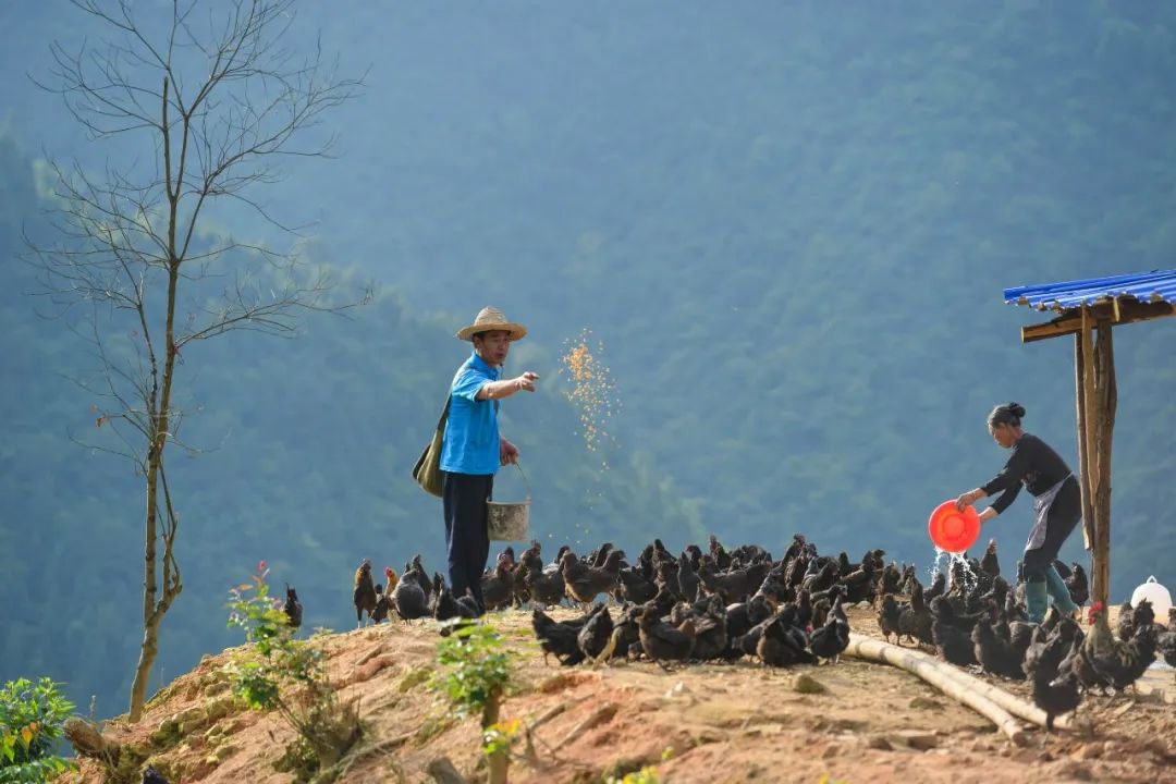 贵州省黔东南州剑河县,杨精泽(左)与村民在合作社里喂鸡