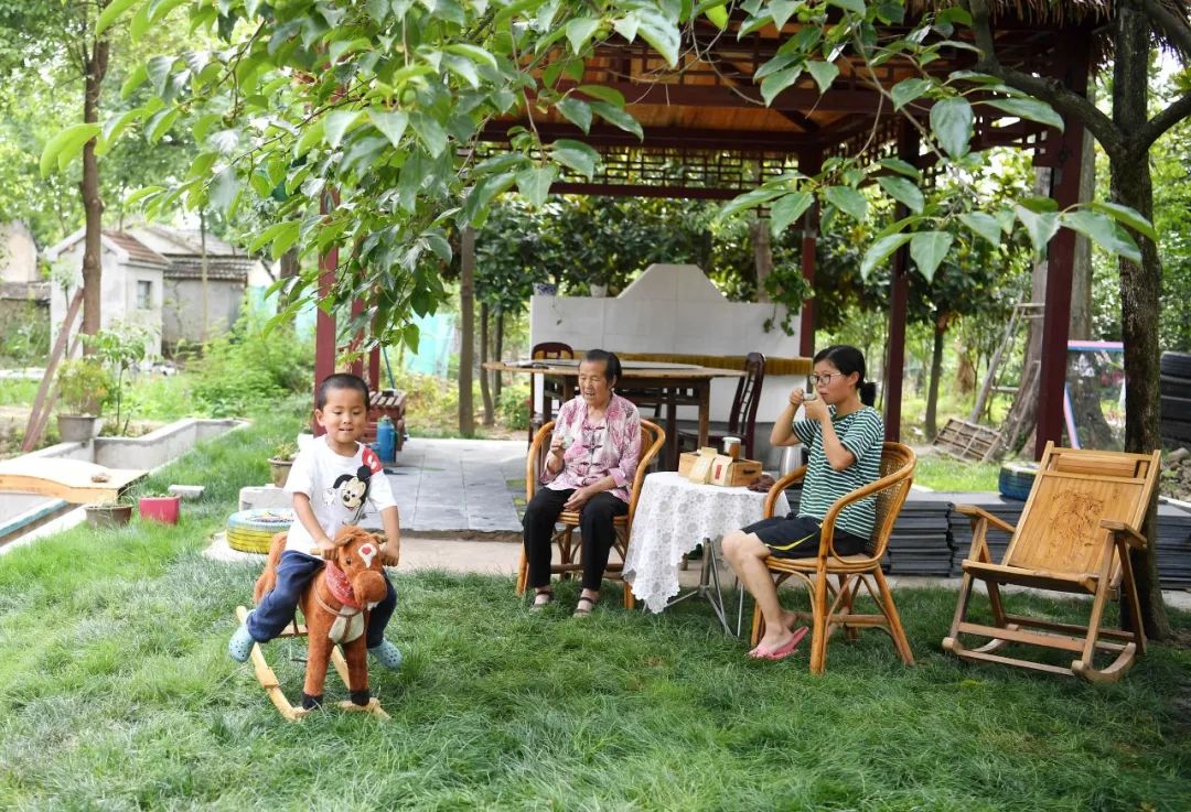 安徽省肥西县上派镇大墙村村民孙丽燕(右)和家人在自家小院里休息