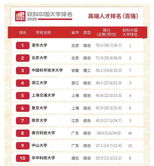 2020软科中国大学高端人才排名中,清华大学、北京大学领跑,随后是中国科学技术大学、浙江大学、上海交通大学、复旦大学、南京大学,排名第八的是南方科技大学,其后为中山大学、华中科技大学。