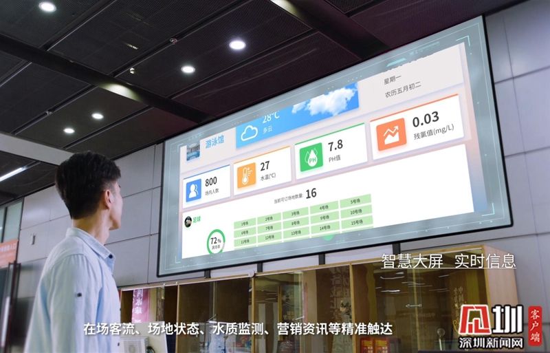 在大运中心游泳馆前台,一块智慧大屏不断滚动播放着场馆内的人流、设施等重要信息。场地使用数据、场内实时人数、水质温度监测、场馆营销推广等数据和活动信息均通过这块屏幕进行呈现,市民抬头即可看到。而场内的自助售卖机则打通线上线下会员体系,市民可进行积分兑换、会员卡抵扣等,实现无接触售卖。