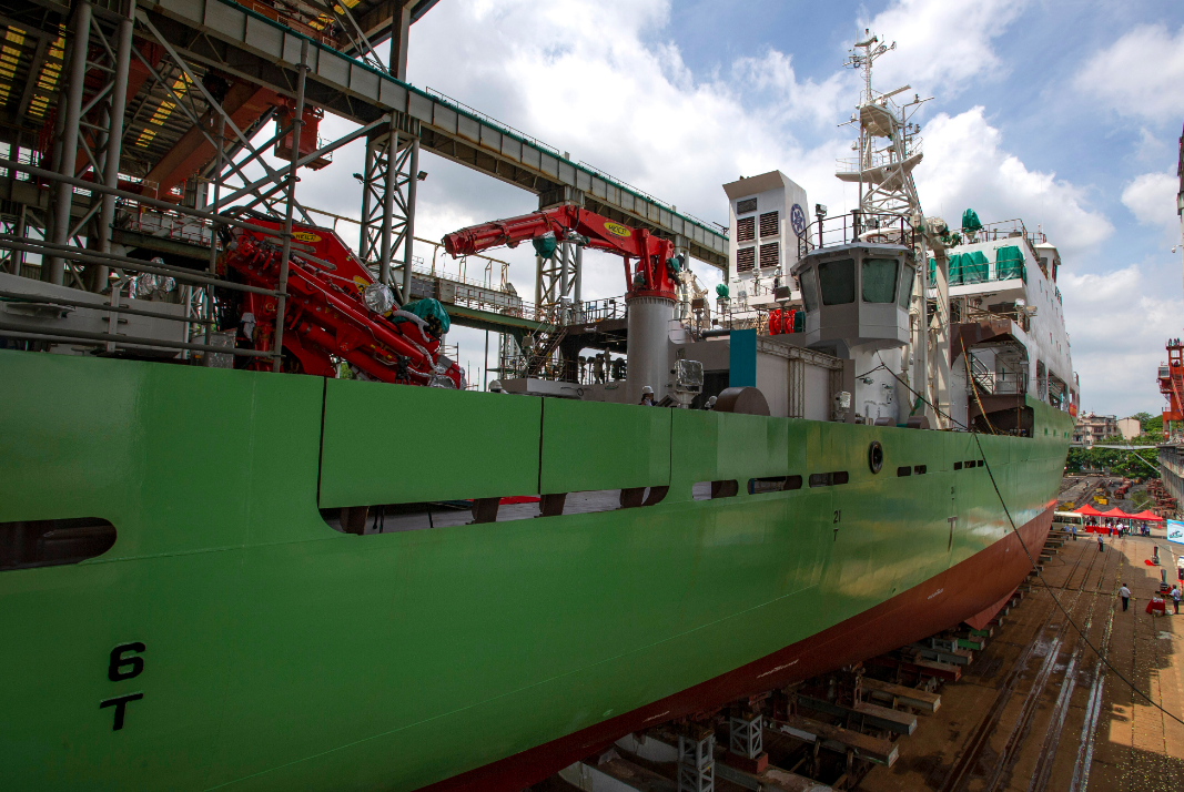 7月18日上午,“实验6”在黄埔文冲船舶有限公司露出了“真容”。设计总吨3990、总长90.6米的“实验6”不仅“身材伟岸”,更有很多内在的技术特点。
