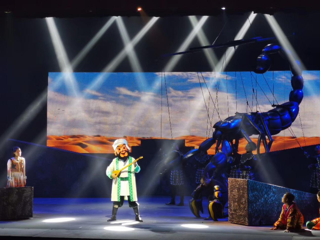 而令观众最为印象深刻的,是此次演出特别设计了一个“反派”角色——一只体积庞大的大蝎子。这一道具以倒吊提线木偶的形式,搭以暗色系的庞大外形,在舞台上极具视觉冲击力。