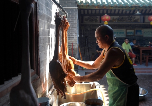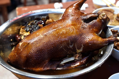 歡宴嘅另一味重要菜肴係客家蒸鵝。客家蒸鵝嘅選材非常進緊要,需要揀又肥又大嘅農家鵝,再用花生油炸到金黃。喺過程入面,要唔停噉翻動油鑊裏面嘅鵝,令到佢均勻受熱,都係一門技術。調料嘅配製同樣非常講究。「蒜頭、紅腐乳、紅糖、蚝油、陳屁、生抽……」葉老先生一口氣列出七八種配方。只見葉老先生快速將一大盆配好嘅調料灌入已炸到金黃嘅鵝肚入面,然後喺鵝嘅身體表面再抹上一層,呢味客家蒸鵝嘅香味很快就散發出嚟嘞。