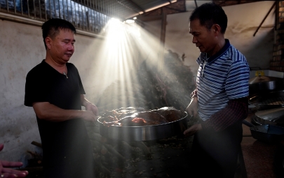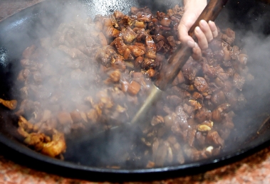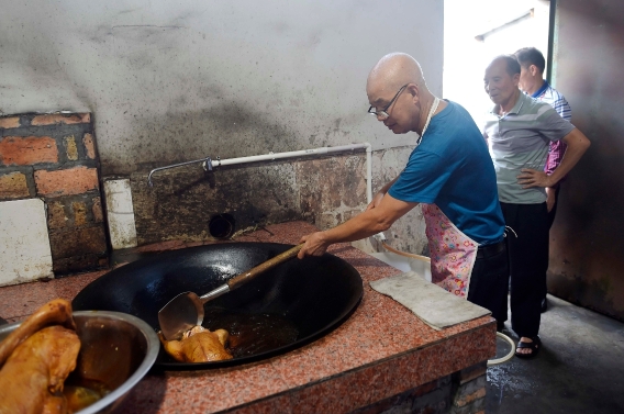 葉老先生係葉氏宗祠理事會副會長,同時亦係歡宴嘅總指揮,不單止負責統籌安排仲要親自下廚幫每道菜把關。每次宗祠家宴,佢都係主掌勺人之一。喺塘廈龍背嶺,「太公分豬肉」唔係簡單嘅豬肉分配,而係需要廚藝精湛嘅廚師將生豬肉做成大名鼎鼎嘅客家燜豬肉,再分畀大家。豬肉先用白糖、豉油、米酒腌十幾二十分鐘,再喺大鑊入面炒到變金黃色,最後放豆腐入去燜40分鐘左右,一味肉色紅亮、質地柔軟、湯汁油潤嘅客家名菜——燜豬肉就炮製成功嘞。