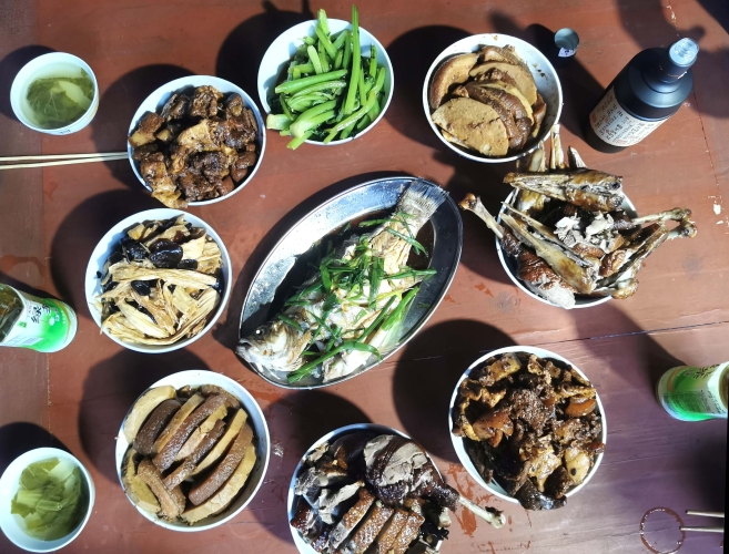 燜豬肉、客家蒸鵝、客家香芋扣肉……經過大半日精心準備,一碗碗色香味俱全嘅客家特色菜就整好嘞。晚飯時間,族人坐埋一圈食家宴,傾閑偈。