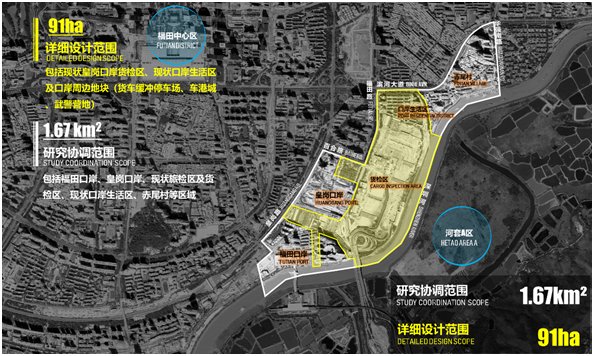 竞赛由深圳市投资控股有限公司主办,深港科技创新合作区发展有限公司承办,深圳市规划和自然资源局、深圳市建筑工务署、福田区人民政府为技术指导单位,旨在落实关于皇岗口岸片区遴选国际一流设计师进行整体设计、统一开发、连片建造的要求,通过“定向邀请5家+资格预审10家”的方式,遴选了15家国际知名设计机构参赛。其中,详细设计范围包括现状皇岗口岸货检区、口岸生活区及口岸周边地块,面积约0.91平方公里;研究协调范围为河套C区,包括详细设计范围及周边的福田口岸、赤尾村等区域,面积1.67平方公里。