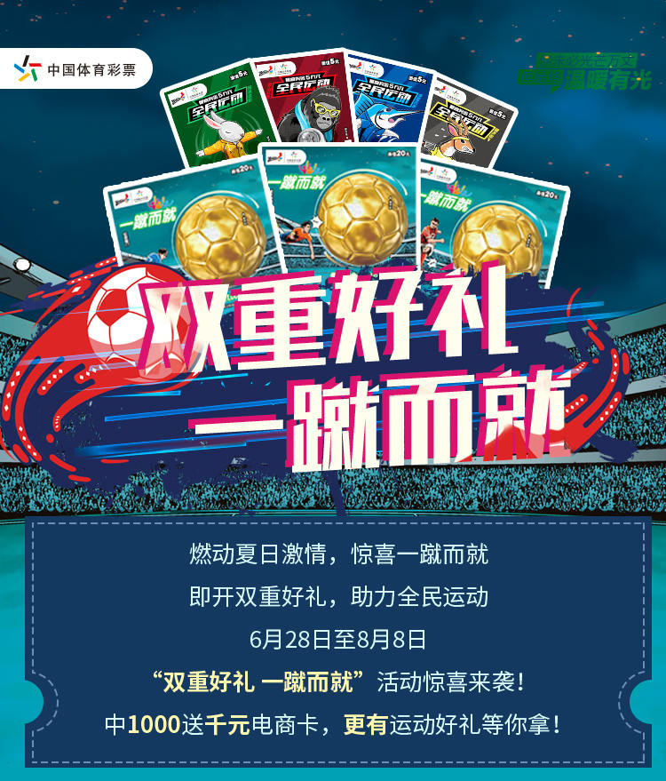 从2020年6月28日9:00:00~7月31日23:59:59,在体彩实体店购买任意面值的“一蹴而就”系列即开型体育彩票(5元、20元),单张彩票刮中1000元奖级,即可额外获得面值1000元的电商卡一张。奖品共计3100个,如7月31日23:59:59前奖品派送完毕,则活动提前结束。