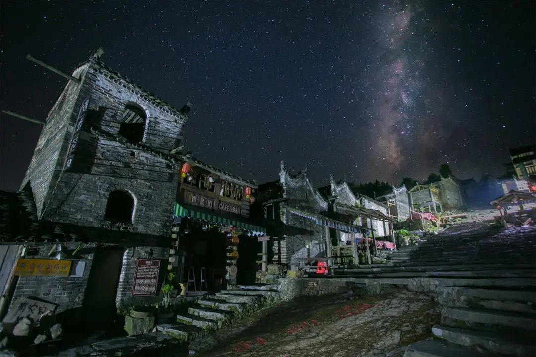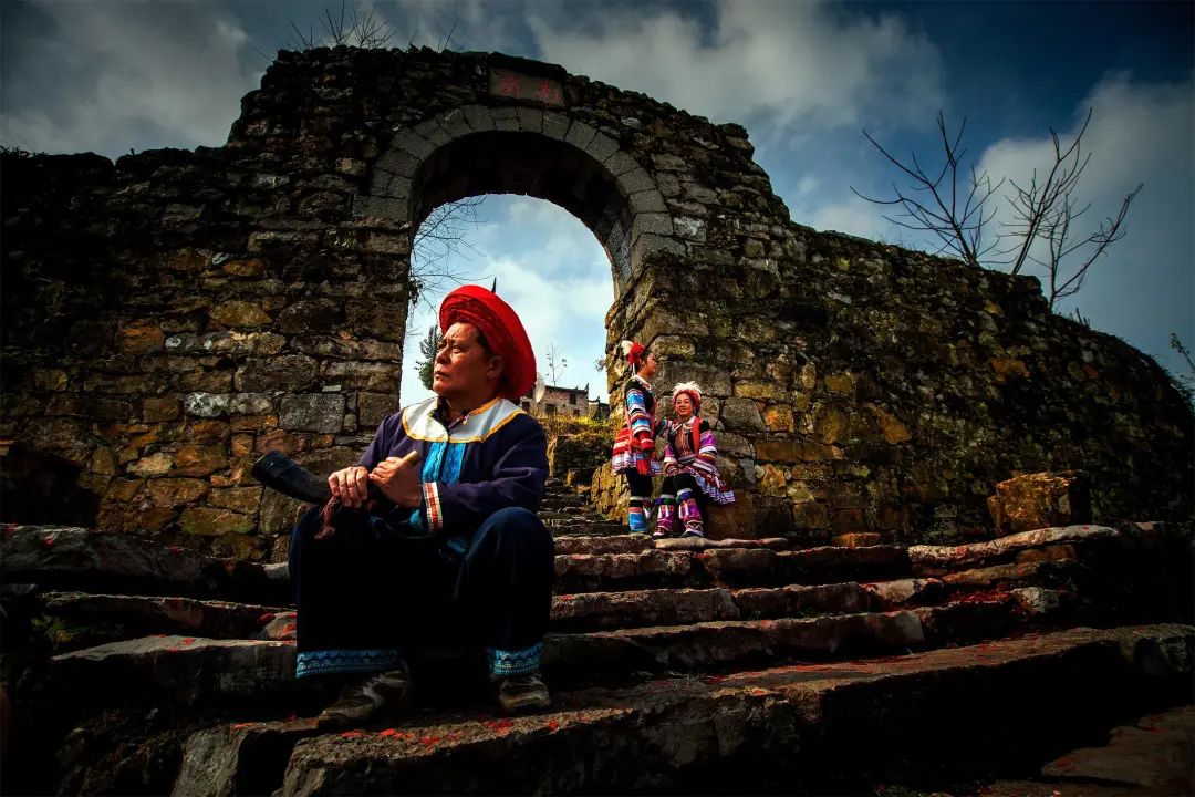 一条长长宽宽的青石板台阶横亘在眼前,一旁竖立着一根木头,木头上写着四个大字“千年瑶寨”。拾级而上,历史的一缕缕烟云,仿佛就要从石阶上冒出。往前看,石寨门和寨墙,皆为大石块垒砌,石门前身着盛装的瑶族沙腰妹,已热情地端着一碗碗白米酒,正热烈地欢迎你的到来。喝过这碗热情酒,一阵阵温婉的歌声飘荡起来,原来是伫立在坡上,撑着油纸伞的沙腰妹,一脸笑眯眯地唱歌。清清白米酒,温婉迎客歌,一进山门,就能感受一番浓浓的瑶族风韵,吉祥又美好。