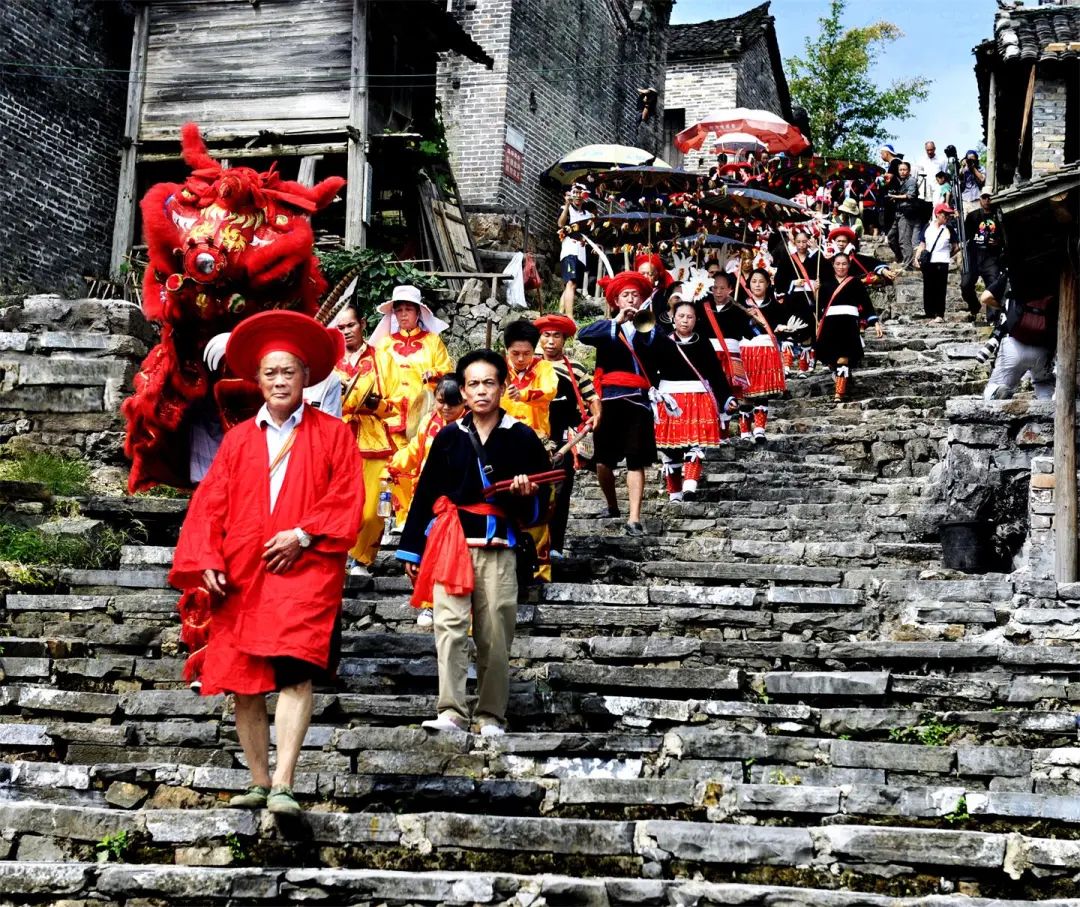 吃过豆腐花,沿着宽宽青石板街,一直往前走到高处,便是瑶寨的盘古神庙。从寨门到歌堂坪,至古庙,这条长长青石板街是全寨主干道,可以快速地感悟一番古寨的繁华前生与热闹今世。如果用花来比喻,这条主干道青石板街的风景,不管是前世还是今生,都绝对是一朵灿烂热烈的花!