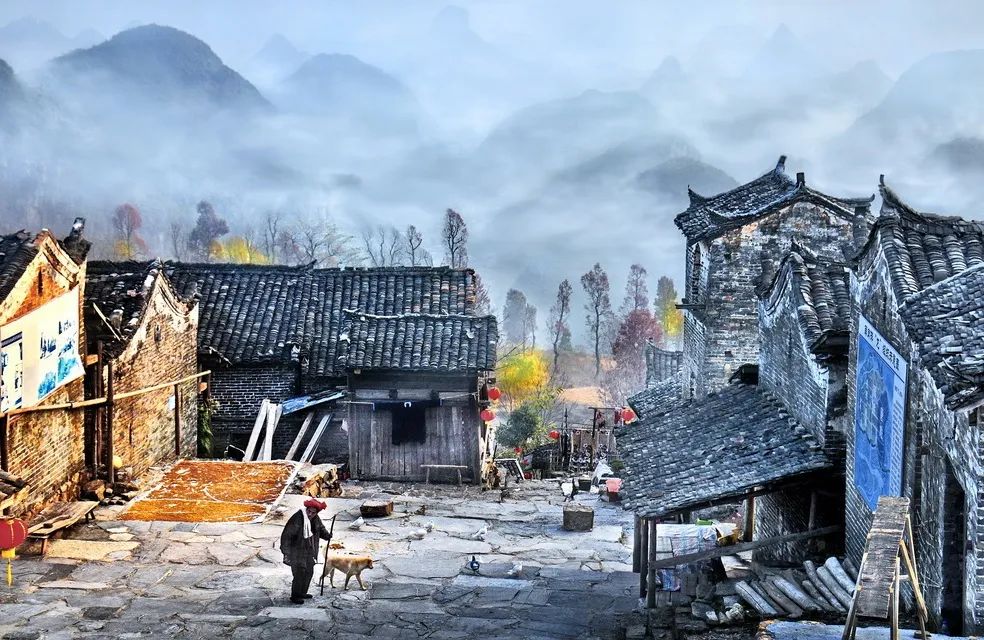感悟了一番古寨肌理,不妨再去溜达左边巷道。巷道静得出奇,经常不见人影,听到的只是自己踩在石板路上发出的清脆声响。这一声声清脆,似乎把巷道的光阴,拉向远古,拉向远山。你不妨走入一间青砖黛瓦,上到楼台,放眼遥望,参天古树红黄相间,崇山峻岭连绵起伏,梯田绿野层叠蜿蜒。山寨仿佛隐居在尘世外,萦绕出一片迷幻的色彩。如果用花来比喻,这左边巷道目光所触的风景,就是一朵半开半闭却难掩一身艳丽的花,用“石榴半吐红巾蹙”这句古诗形容,最为贴切了。