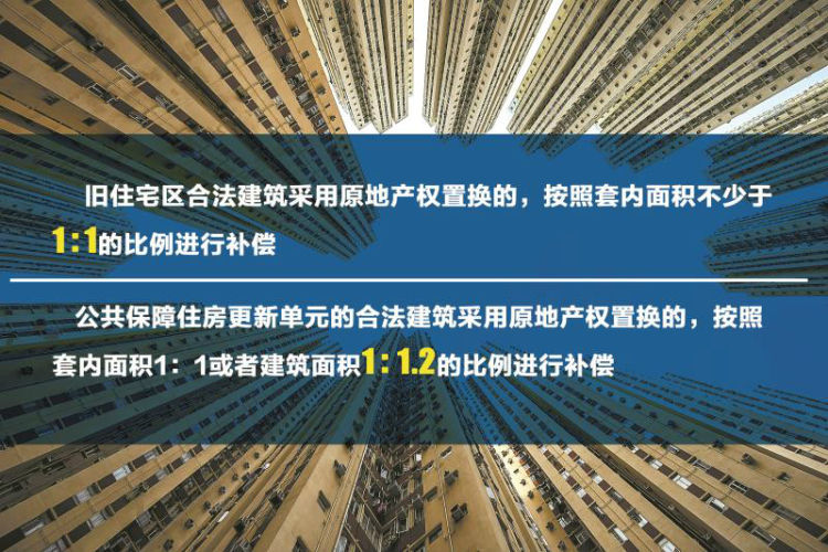 同时,明确了法定最低补偿标准,规定旧住宅区合法建筑采用原地产权置换的,按照套内面积不少于1:1的比例进行补偿,产权置换面积因误差导致不足的,由市场主体按照该项目商品房备案销售价赔偿;超出面积误差在3%以内的,物业权利人可以不再支付超面积部分的房价;采用异地产权置换的,安置房面积按照与原地产权置换等价值原则进行折算;采用货币补偿的,货币补偿标准按照我市房屋征收相关规定确定。