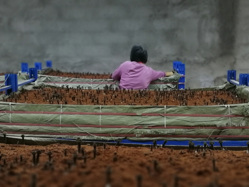 室内控温立体种植高附加值食用菌(黑皮鸡枞菌等)是广州驻兴宁扶贫工作组在2018年大棚种植和2019年野外种植成功的基础上,2019年在大村村四季美基地引导建设了兴宁市首个控温控光室内食用菌立体多层种植基地。
