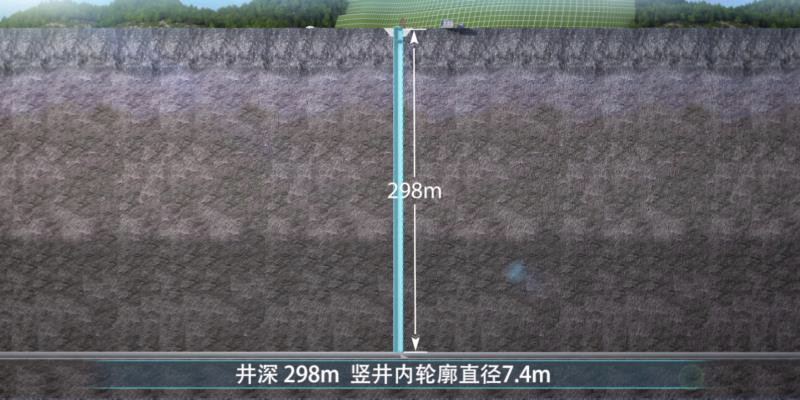 通风竖井位于鸿图特长隧道右洞一侧距离中线33.7米处,通过排烟道和送风道与洞内相连,类似于一根巨型“吸管”竖立在隧道中。内轮廓直径7.4米,最大开挖外径9米,井深298米,相当于100层楼高,是广东省在建高速最深的隧道通风竖井。
