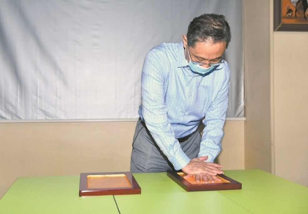 这位继非典之后以84岁高龄再度出征的战士,一脸郑重地在一对金色印泥上摁下了他的一双手印。他先将左手放在印泥上,再用右手覆盖其上,用力按压,按出左手手印。然后,再换一盒印泥,按出右手手印。他的动作缓慢,神色庄重,整个过程充满仪式感。