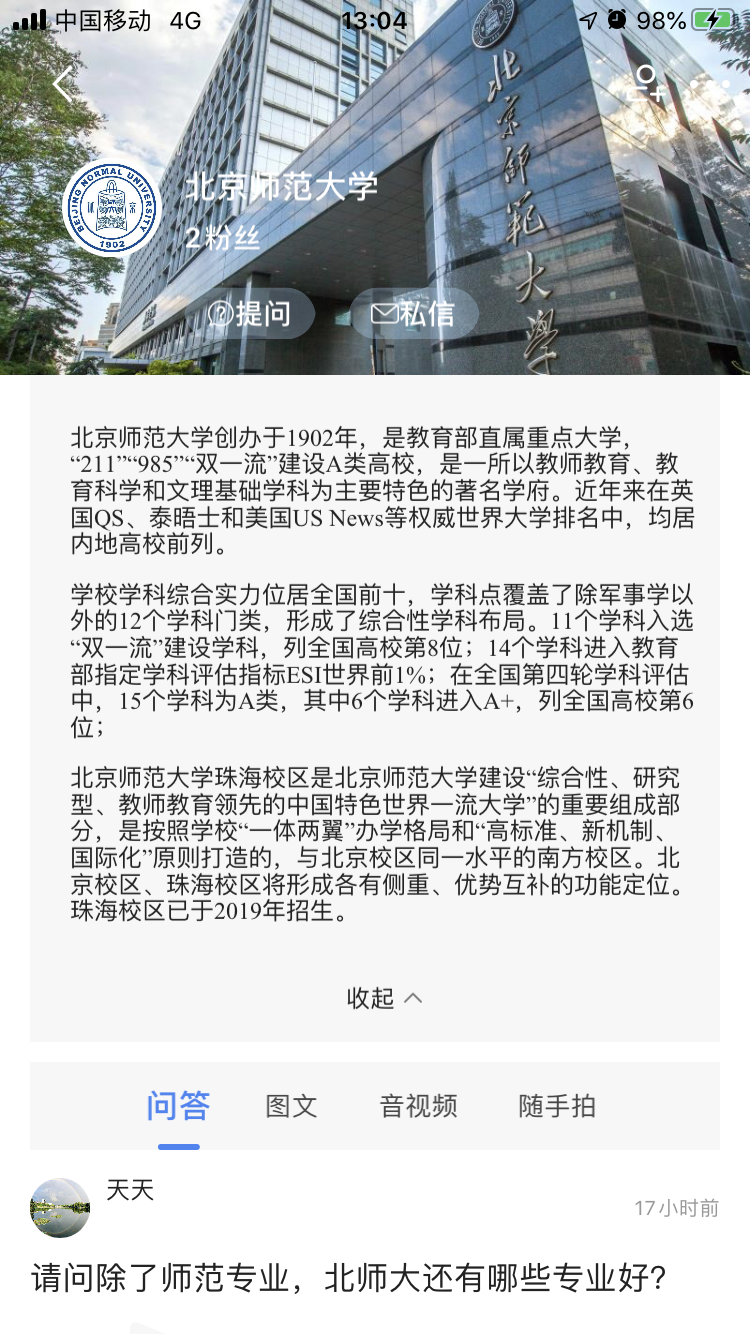 3.考生和家长可在各所学校页面中选择“提问”和“私信”进行互动,此时需进行简单注册。各位家长在注册时请注意,如果您是苹果手机用户,建议使用手机号码进行注册,并修改昵称,或在使用微信登录后,再绑定手机号码。如果您是安卓手机用户,则无需绑定手机号码。