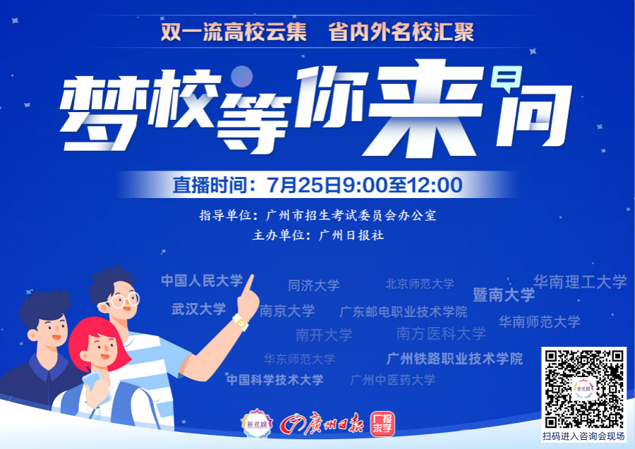 昨天,今年广东高考正式放榜。手握成绩单的考生,最紧要的是填好志愿。为更好地保障和服务考生志愿填报需求,并保障防疫工作有效落实,由广州市招考办指导,广州日报社主办,广州日报求学承办的“2020年广东高考招生线上咨询会”将于7月25日9:00—12:00在新花城App举办,并进行实时直播。