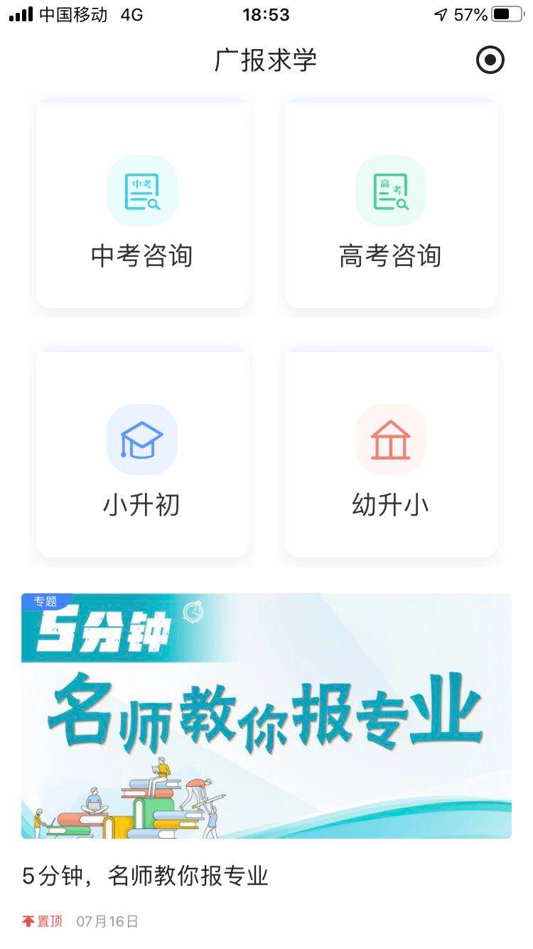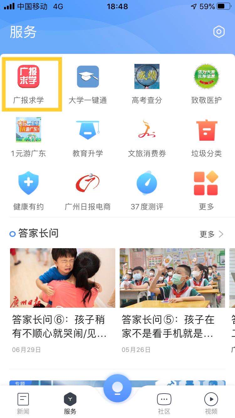 2.进入APP首页,点击首页下方“服务”板块,再点击 “广报求学”,随后点击“高考咨询”,就可进入咨询页面。