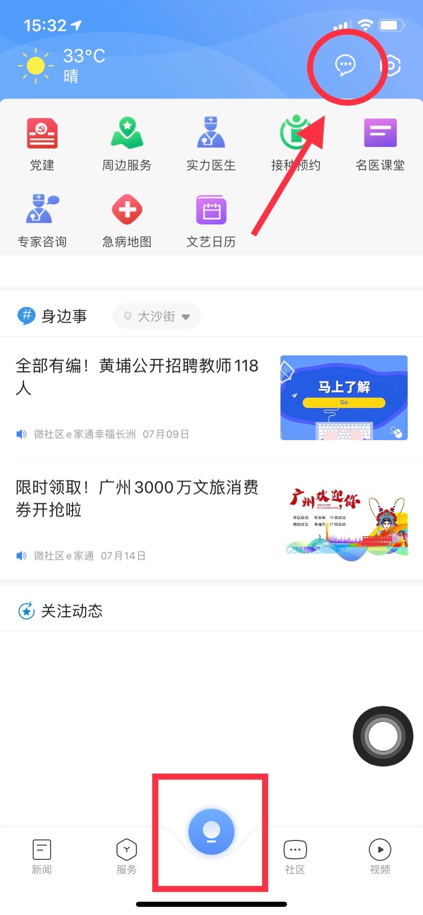 4.点击新花城APP主页面底部中间的蓝色按钮,即可获知最新消息。“消息框”可以查看互动消息,“关注动态”将展示你关注的学校的动态。