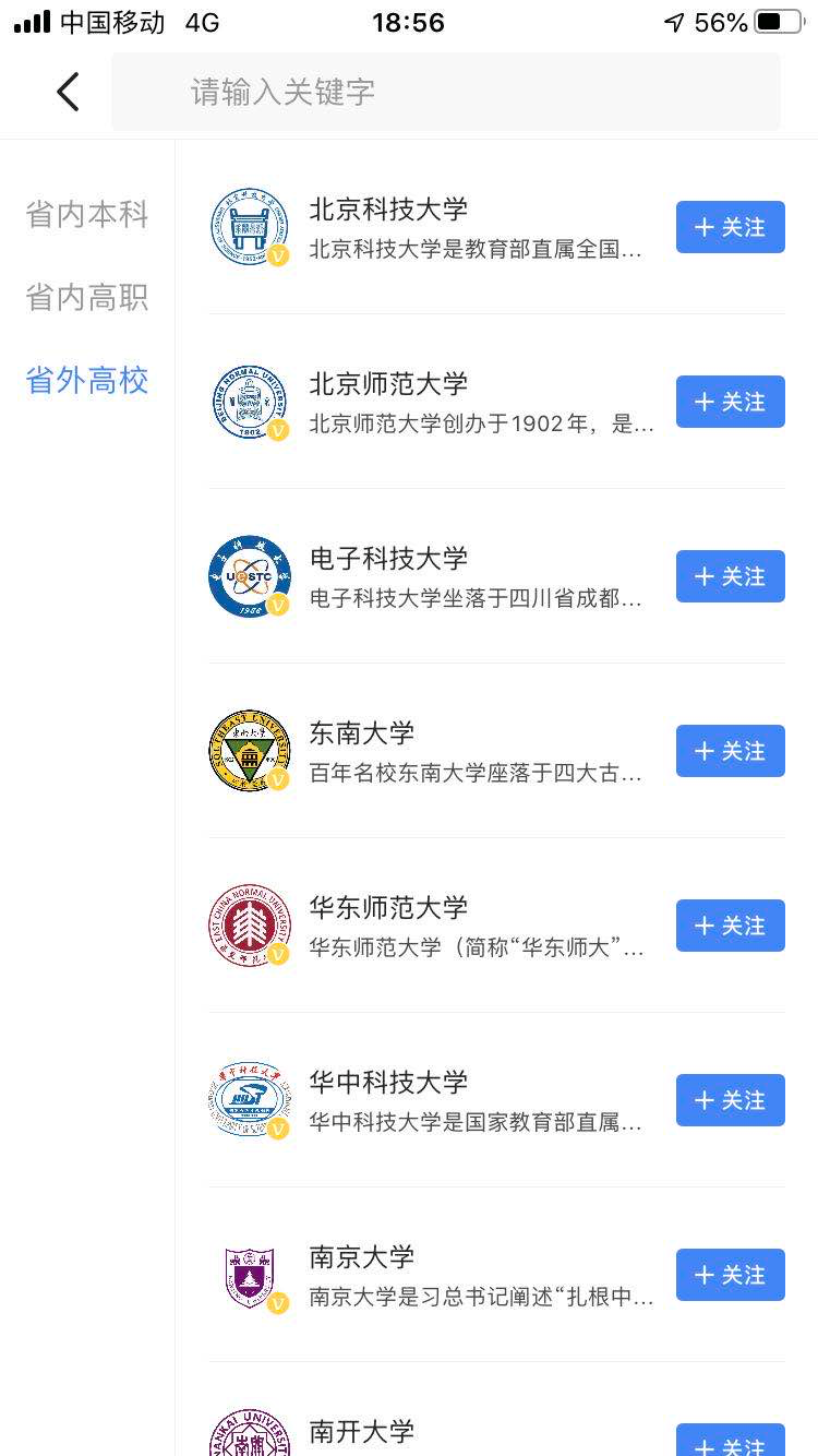 您可以按照学校所属类别(省内本科、省内高职、省外高校)查找,或者在搜索框搜索,点击对应学校一栏右方的“+关注”,即可查询该校展示的图文和音视频等信息,也可进行在线咨询。