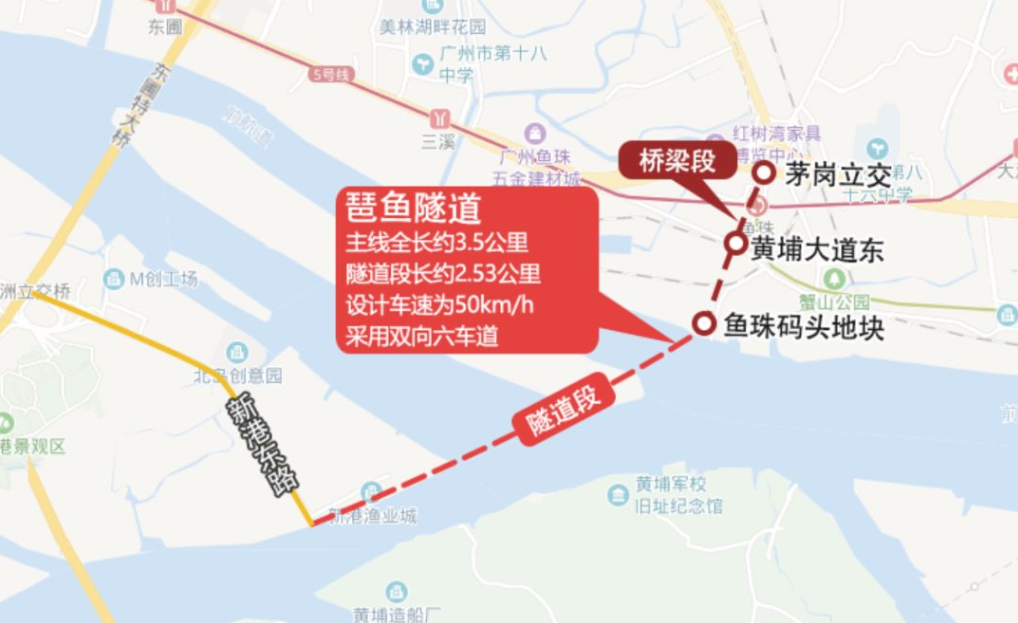 琶鱼隧道南起新港东路,采用隧道形式下穿珠江,在珠江北岸下穿鱼珠码头地块及现状黄埔大道东后接地,继续向北以桥梁形式接入现状茅岗立交。道路等级为城市主干路,道路红线宽60m,设计车速为50km/h,采用双向六车道盾构隧道。主线全长约3.5km,其中隧道段长约2.53km。项目总投资约47.40亿元。