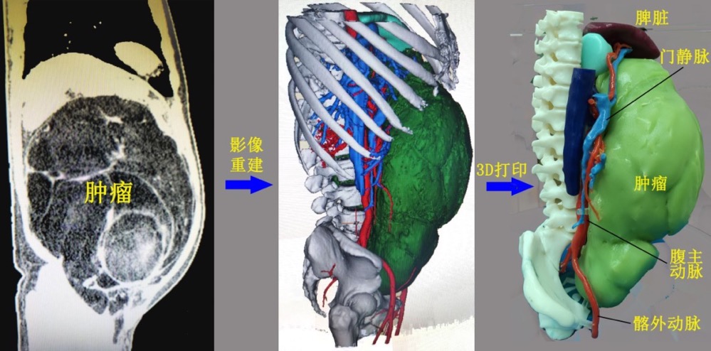 据刁德昌教授介绍,腹膜后肿瘤发病隐匿,早期几乎没有任何症状,或以腹部包块为主,由于腹腔空间相对较大,故诊断相对困难。大部分患者就诊时肿瘤体积十分巨大,且侵犯周围血管、脏器,手术难度大,风险高。而3D人体打印技术在诊治腹膜后巨大肿瘤具有独特优势,它可以很好地对肿瘤和周围血管、脏器进行重建和打印,实现术前预知、术中导航,使得手术更加精确、安全,让患者在治疗中获取更多益处。