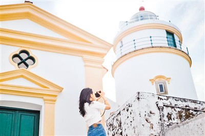 一名遊客在拍攝東望洋燈塔。(資料圖片)