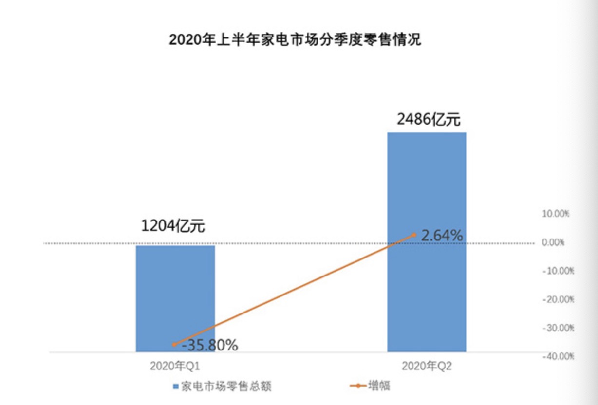 《报告》显示,随着疫情防控向好态势发展和各项促消费政策的落地生效,厂家商家积极调整措施到位,市场销售明显好转,迅速复苏至去年同期水平。第二季度我国家电市场零售总额达2486亿元,两倍于第一季度,同比增2.64%。