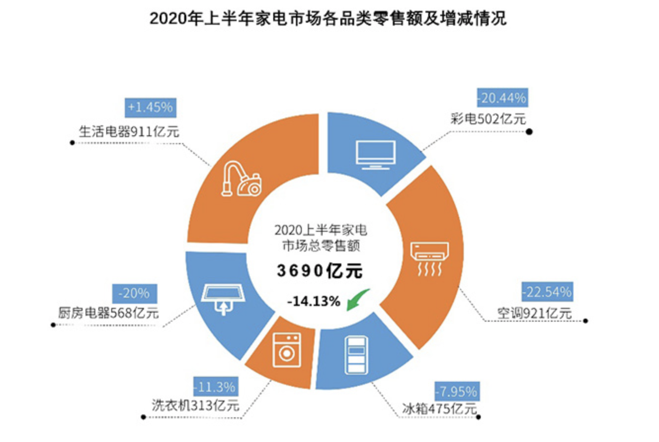 疫情之下,家电市场二季度的表现如何?7月27日,中国电子信息产业发展研究院发布了《2020上半年中国家电市场报告》(以下简称《报告》)。《报告》显示,今年上半年,我国家电市场零售额规模为3690亿元,比去年同期下降14.13%,作为市场日趋饱和的耐用品,家电消费受疫情冲击明显。
