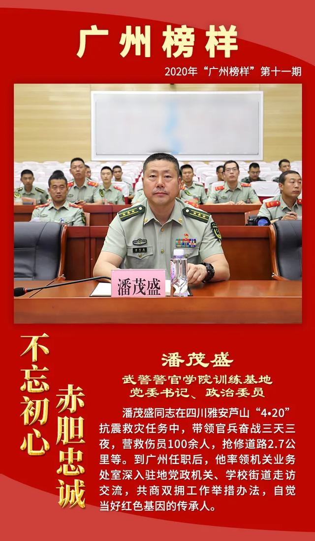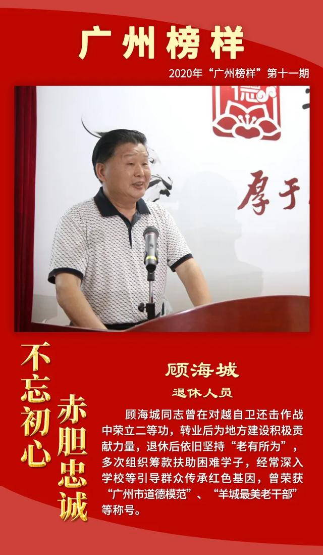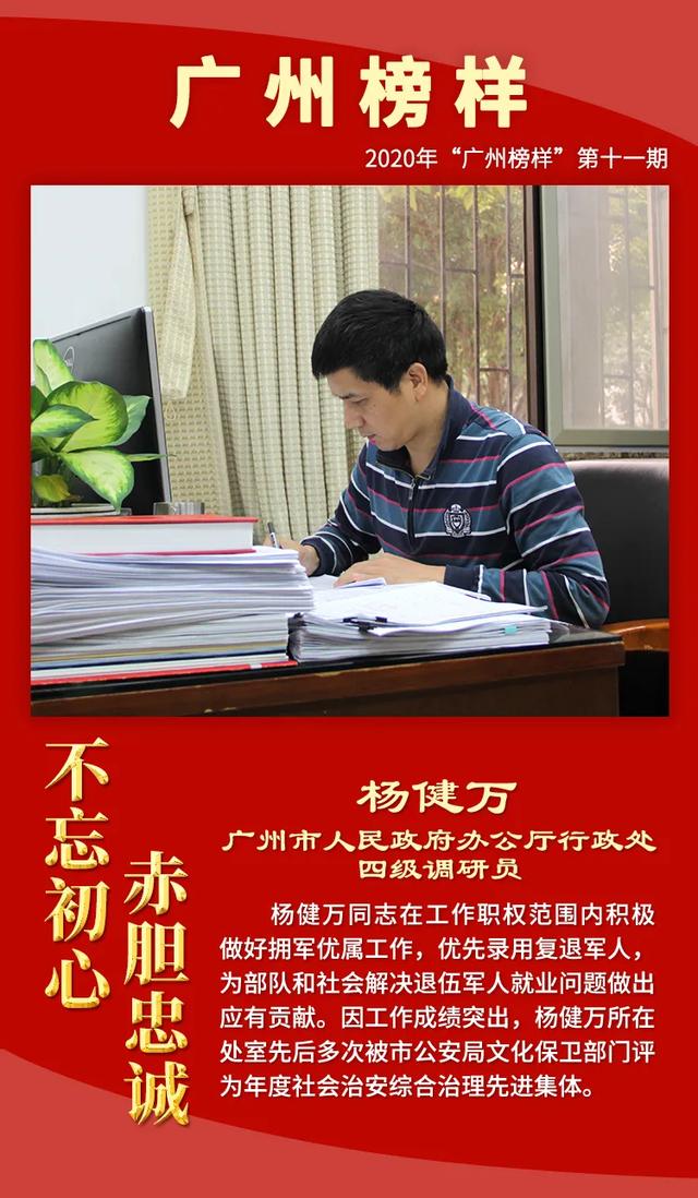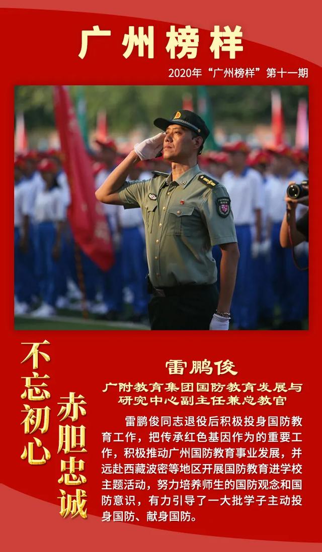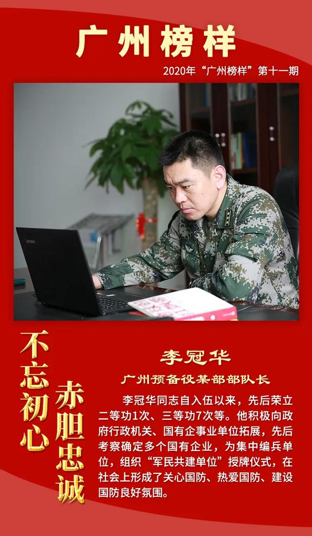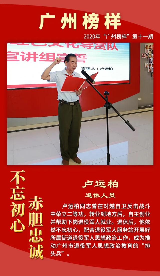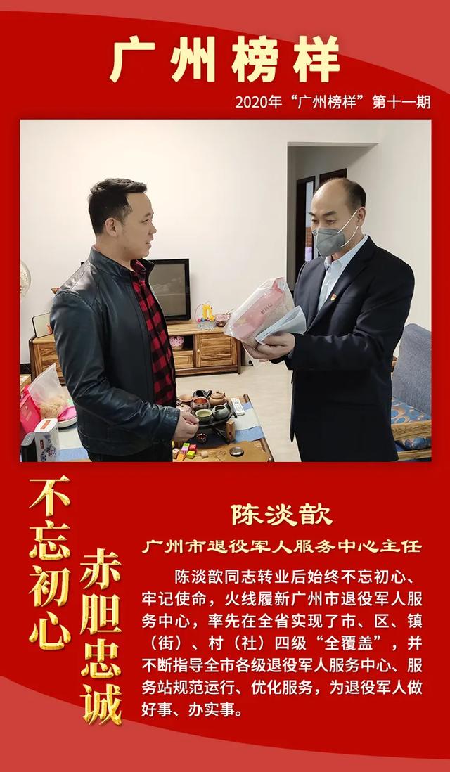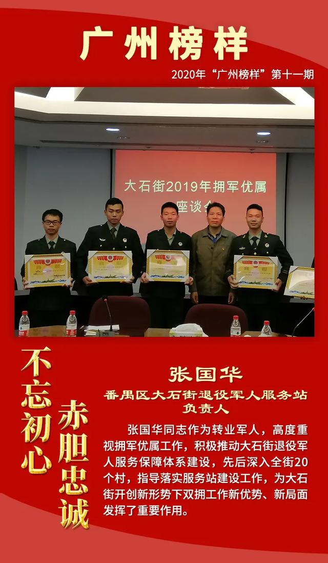 为深入学习贯彻习近平总书记关于退役军人工作的重要论述精神,大力宣传退役军人工作和双拥工作中涌现的先进典型,增强退役军人荣誉感,现举办2020年“广州榜样”第十一期“不忘初心 赤胆忠诚——致敬最美退役军人、最美拥军优属标兵、最美拥政爱民标兵”月度网上发布活动,激励退役军人不忘军人本色,积极奋发有为,争做新时代优秀退役军人。