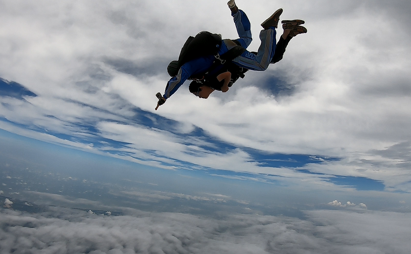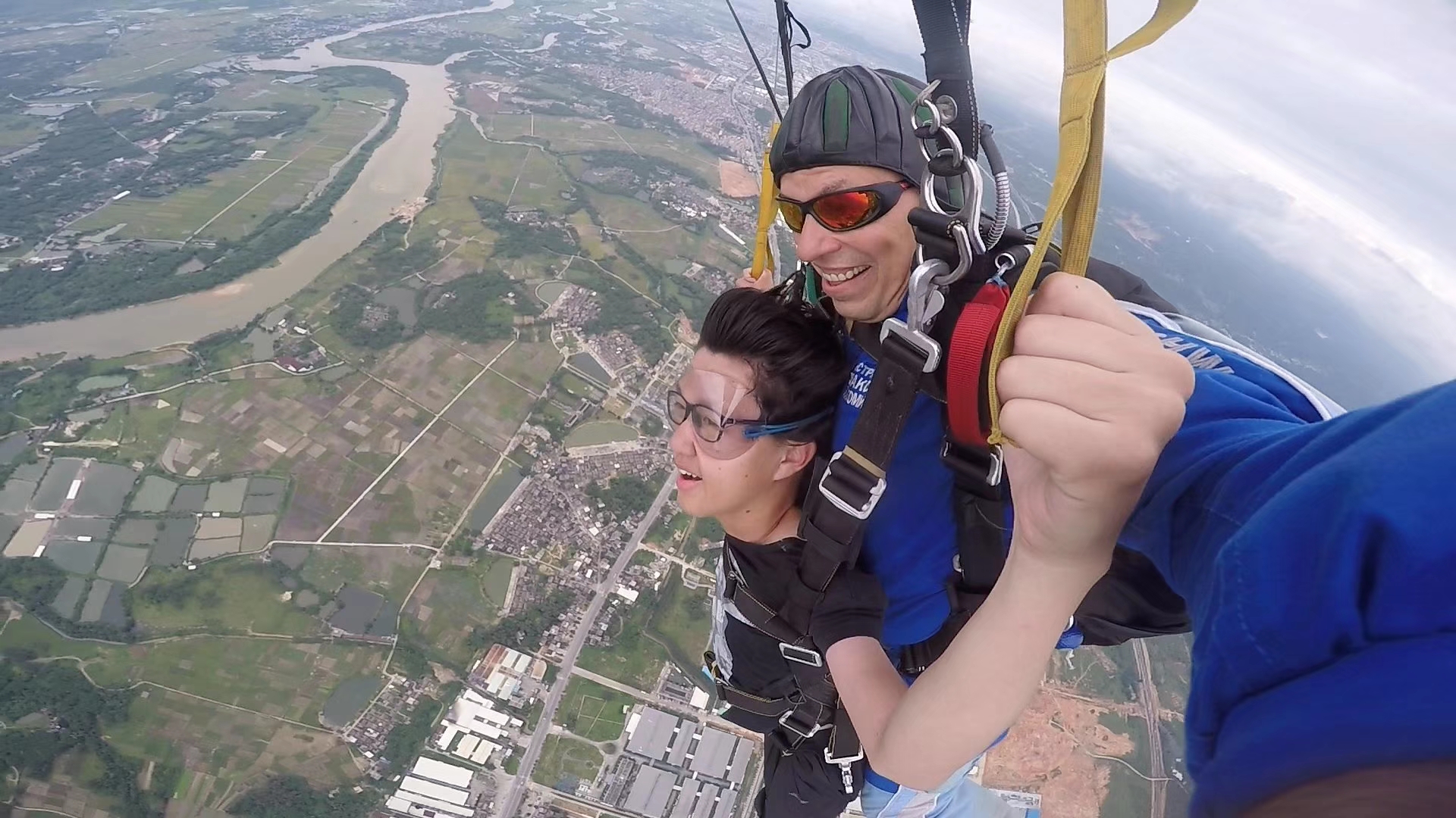2019年夏天,阳江,方坚泽跳伞成功。在4千米的高空,他和教练一起跳了下来,穿过云层,呼吸着自由的空气,这时,他才发现原来云是那么清凉,那么温柔。他们打开降落伞,教练让他尝试拉着降落伞的方向绳,左右控制方向,看着底下的山川、河流和人烟,他觉得人生都变得轻盈起来。那一刻,他的心似乎比谁都更接近蓝天。