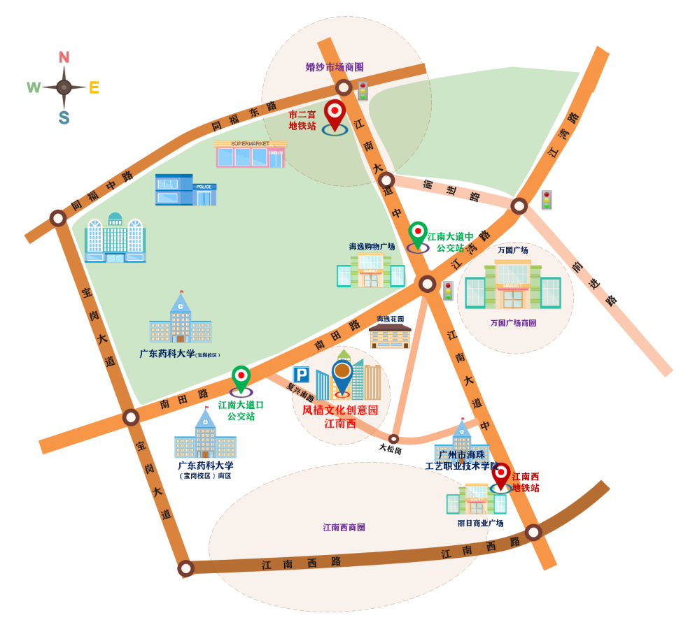 项目位于海珠区江南大道中与南田路交界区,临近万国广场、海怡花园,靠近双地铁口,交通便利。园内总面积1万多平方米,空间规划、设计方面文化气息浓郁,以前瞻的视角、领先专业化运营及科学的规划能力,实现空间的多元化功能。