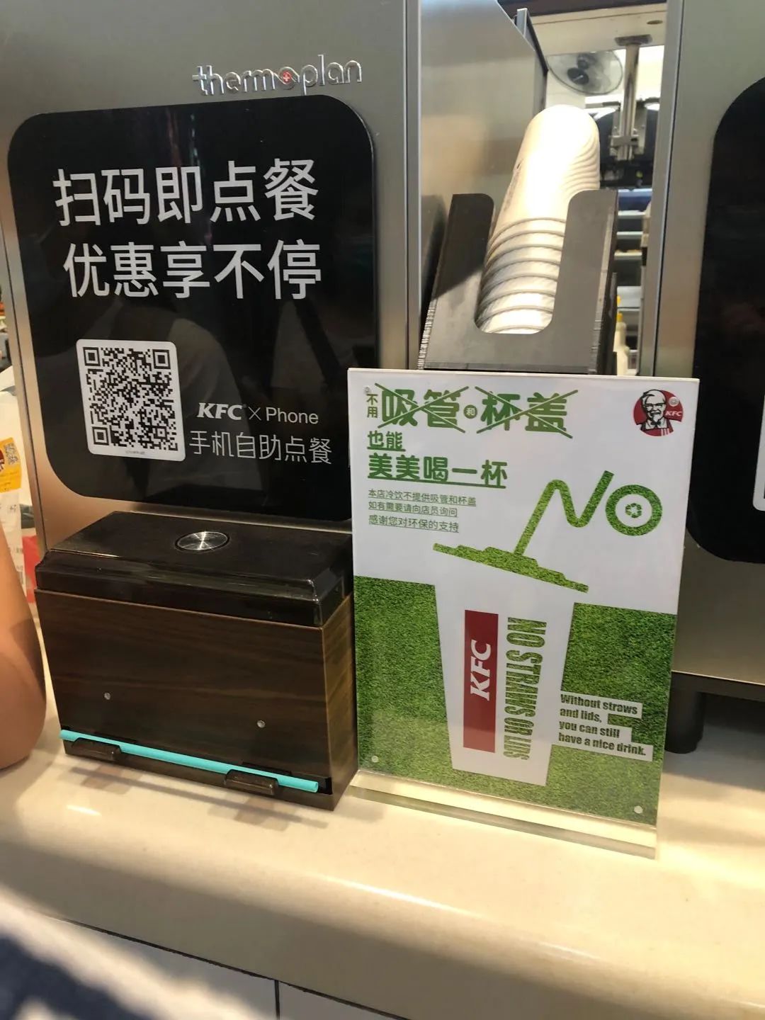 麦当劳把本来放于显眼处的吸管盒收起,外带饮品也未见配一次性吸管。