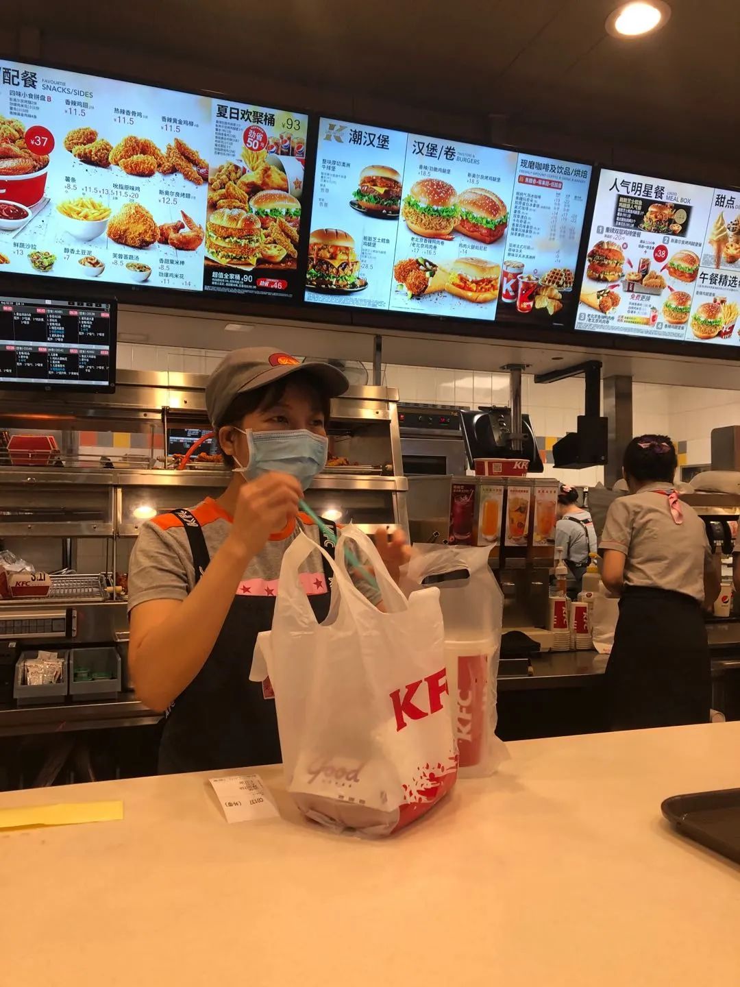 肯德基的服务员正在把一次性吸管放在打包袋里。