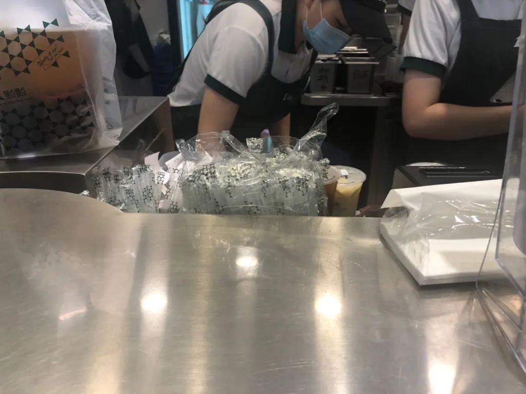 除了小程序下单,在现场购买喜茶,店员也是为顾客提供一次性塑料吸管。