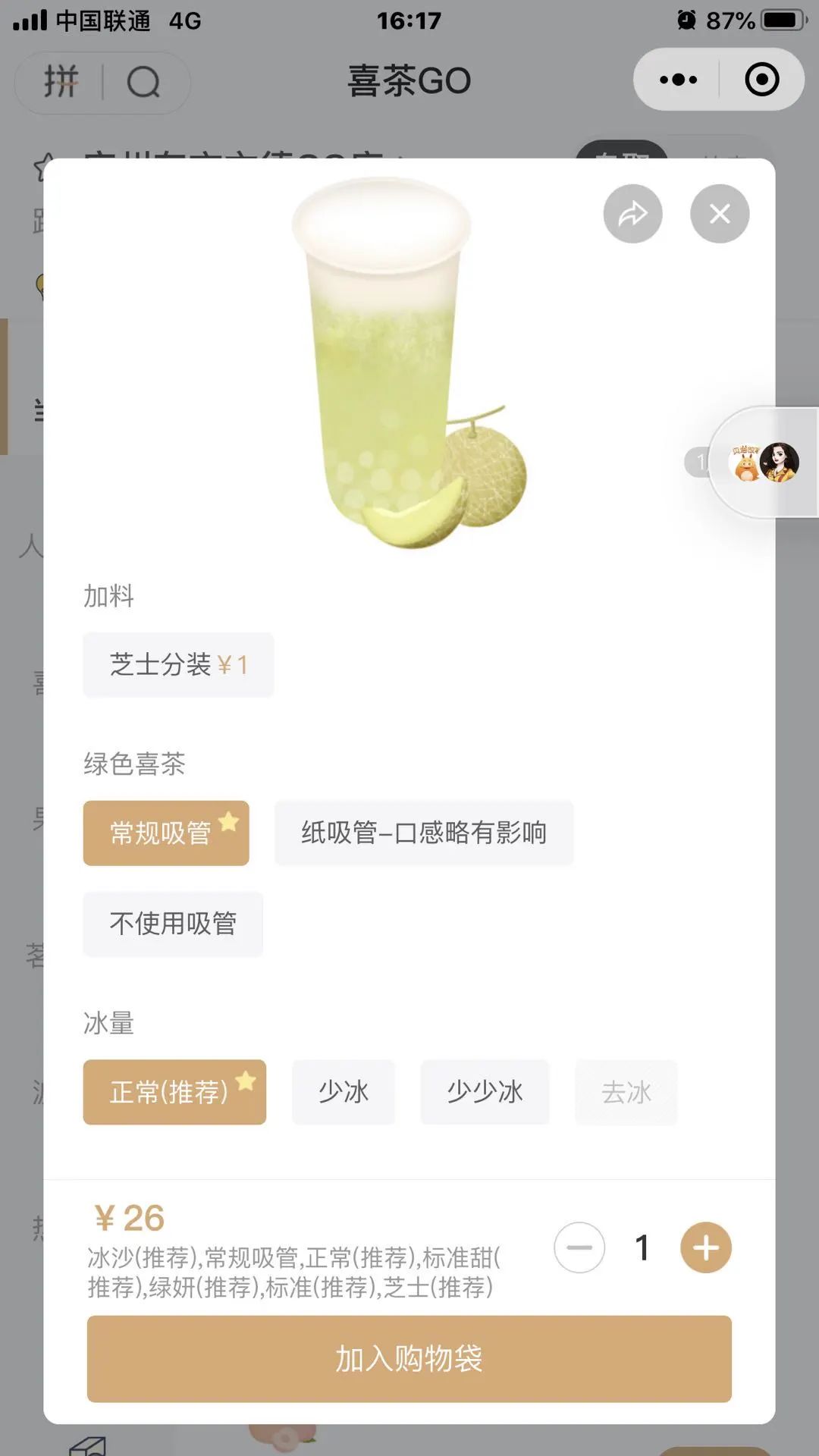 喜茶小程序下单页面中,“常规吸管”为标星选项,且和其他推荐选项一样,排在选项中的第一顺位。