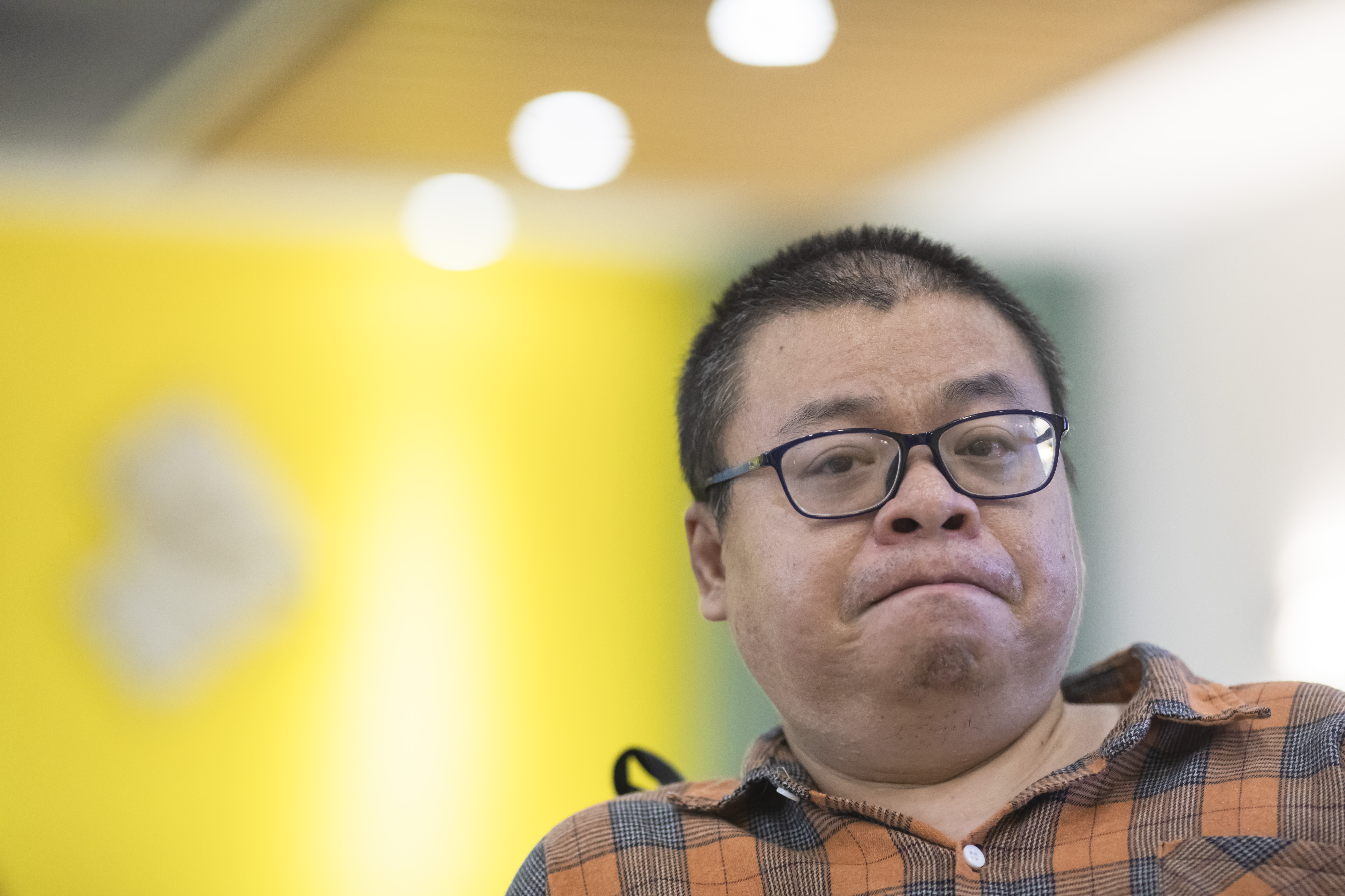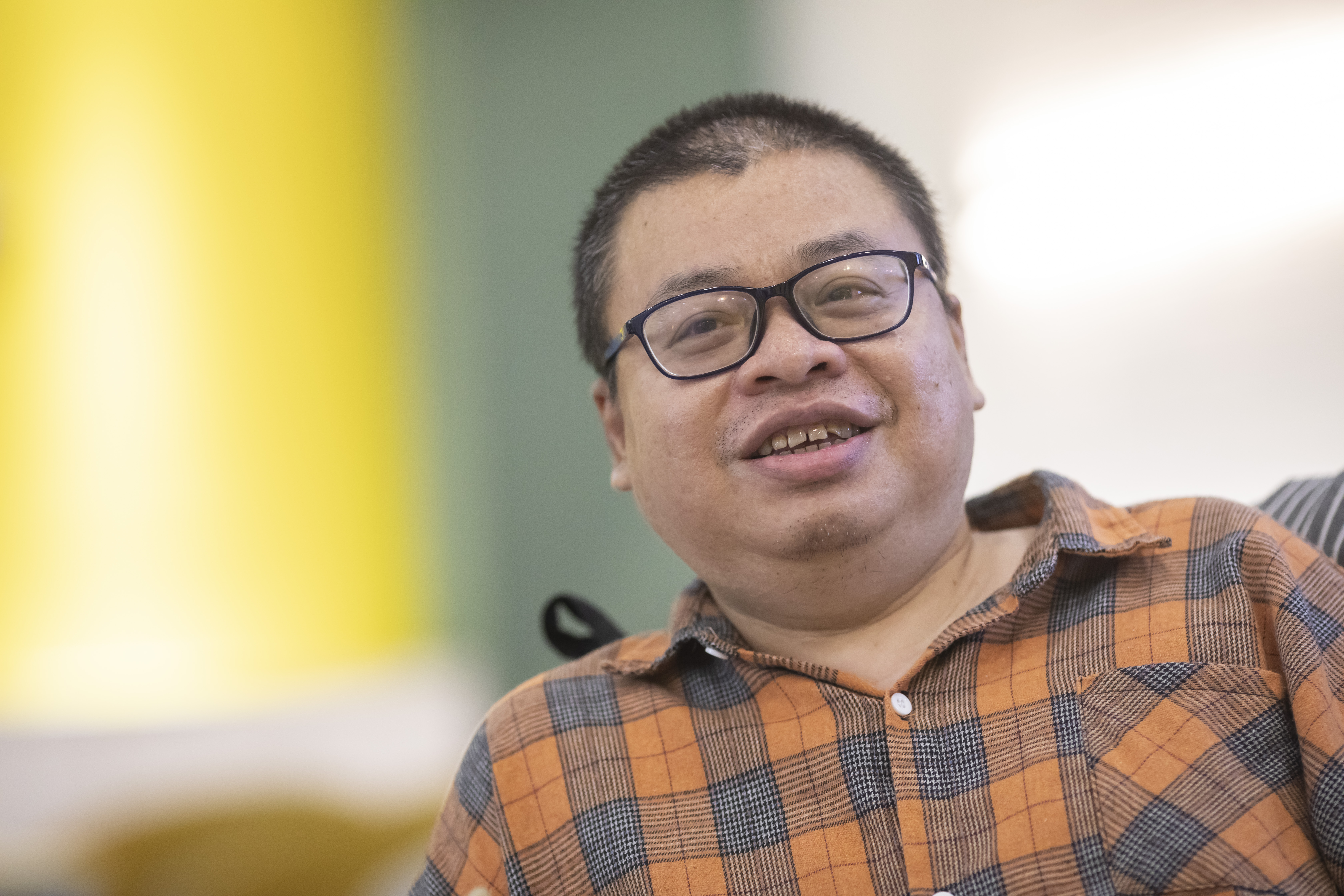 将近50岁的黄志铭吃力地坐在一个依靠手指遥控的电动轮椅上,但仍声音洪亮地向伙伴们介绍“公益就业链”项目。进行性肌营养不良症是一种罕见病,通常分DMD和BMD两种,黄志铭患的是病情发展较缓慢的BMD,患者将成为“渐冻人”,身体无法动弹,却清醒地面对生命的终结。